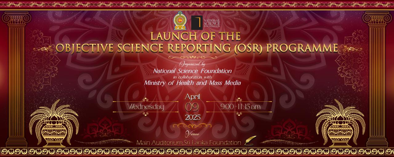 The NSF launched its “Objective Science Reporting Programme (OSR)” jointly with the Ministry of Health and Mass Media successfully which was held on 9th April 2025 at the Sri Lanka Foundation under the patronage of Dr. Chrishantha Abeysena, Hon. Minister of Science and Technology. The ultimate objective of the OSR programme is to enhance the science literacy of the nation. Additional Secretary (Administration), Mr Asai Lakkadas, Chairman of the National Science Foundation, Prof. Saman Seneweera, Director General of the National Science Foundation, Dr Sepalika Sudasinghe, Director (Development) of the Ministry of Mass Media Ms. W.P. Sewwandi, Dr. Jayantha Wattavidanage, Prof. Chandana Jayaratne, Mr Thusitha Malalasekara, Mr Dhanushka Ramanayake as well as the members of the Objective Science Reporting Programme participated for the event. Media personnel representing print and electronic media and social media were also participated in the event.